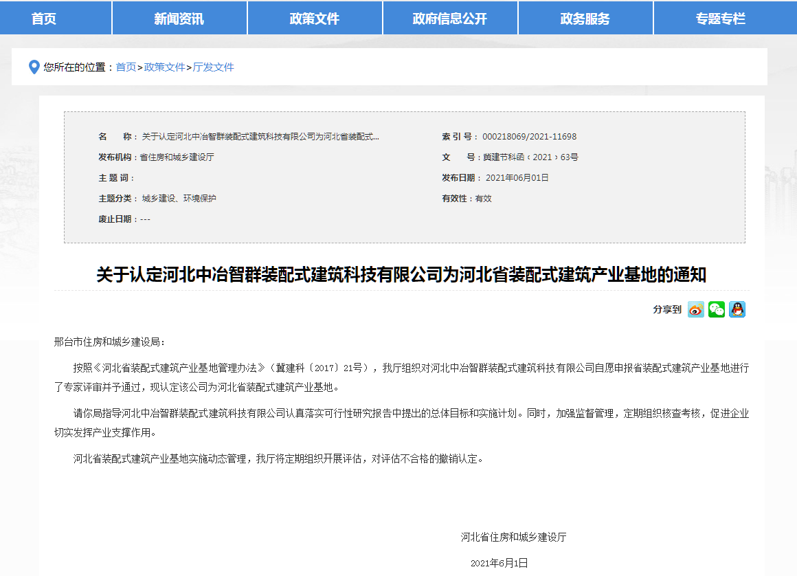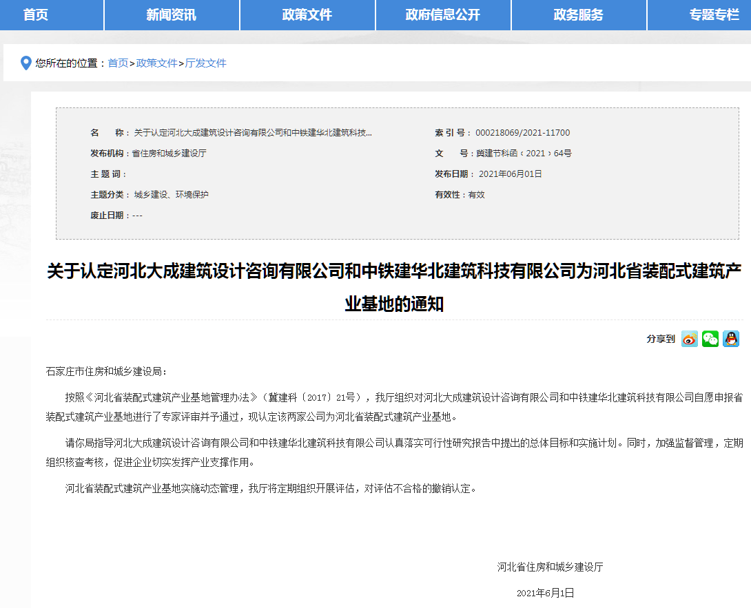 近日,河北省住房和城鄉(xiāng)建設(shè)發(fā)布:《我省新認(rèn)定4處“河北省裝配式建筑產(chǎn)業(yè)基地”》,分別是河北大成建筑設(shè)計咨詢有限公司、中鐵建華北建筑科技有限公司、唐山昱邦新型建材有限公司、河北中冶智群裝配式建筑科技有限公司。