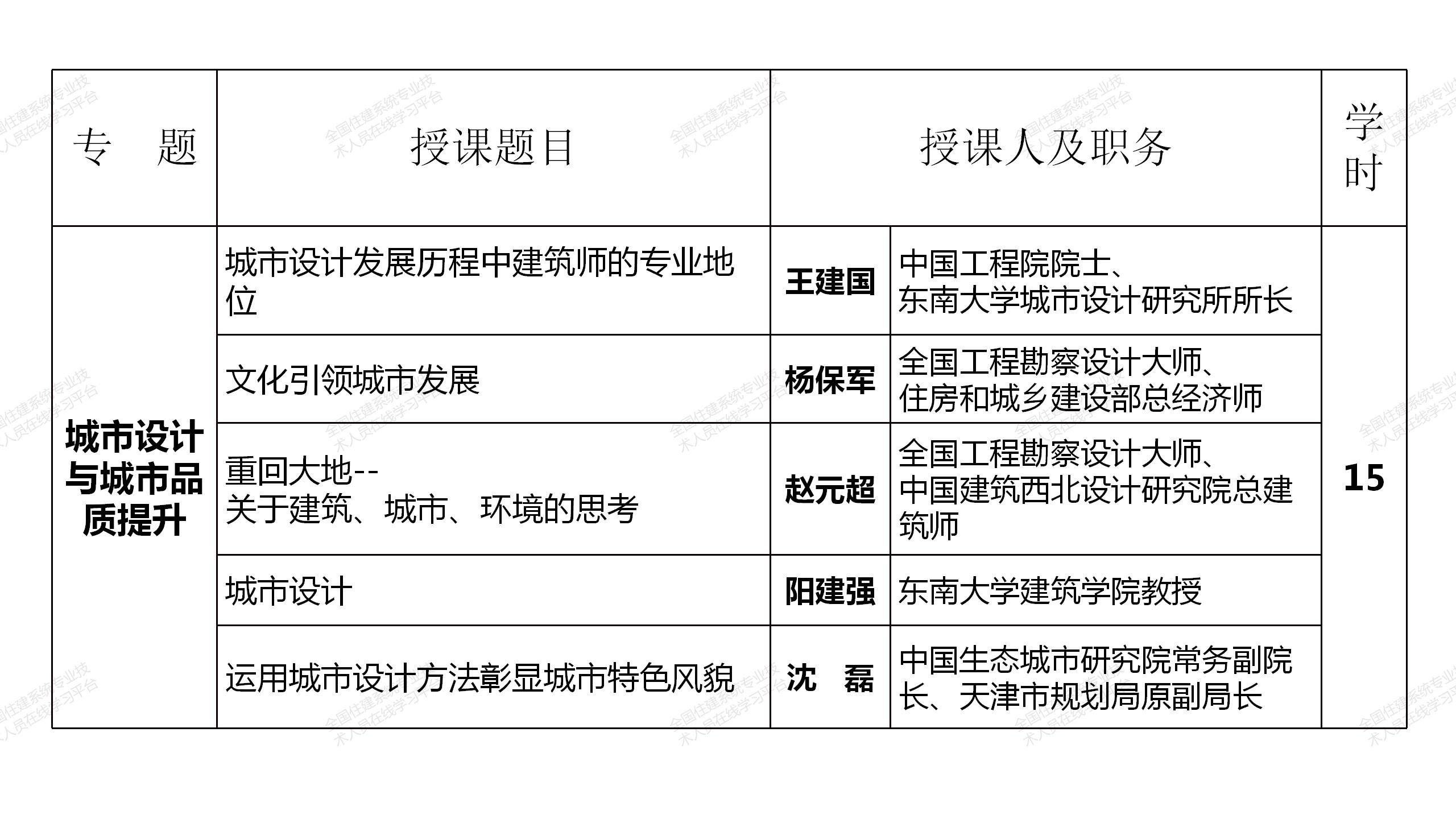 網絡選修課程由中國工程院院士、全國工程勘察設計大師和建筑領域著名專家、住房和城鄉建設部有關領導主講,分政策解讀、城市設計與城市品質提升、建筑創新與文化傳承、綠色建筑與建筑節能、智能建造與建筑工業化和建筑防火設計6個專題共85學時(見附表),注冊建筑師可根據自身需要選擇其中40學時學習,其中10學時的政策解讀專題課程免費提供,并可計入繼續教育學時。課程緊密結合國務院、住房和城鄉建設部近年發布的有關行業改革、裝配式建筑、建筑工業化、智能建造等重大政策,緊跟國家形勢發展需要,是一套集權威性、系統性、針對性、實效性于一體的建筑領域頂尖課程。選修課程于2021年7月12日在“全國住建系統專業技術人員在線學習平臺”(http://www.mayortraining.net)正式上線。